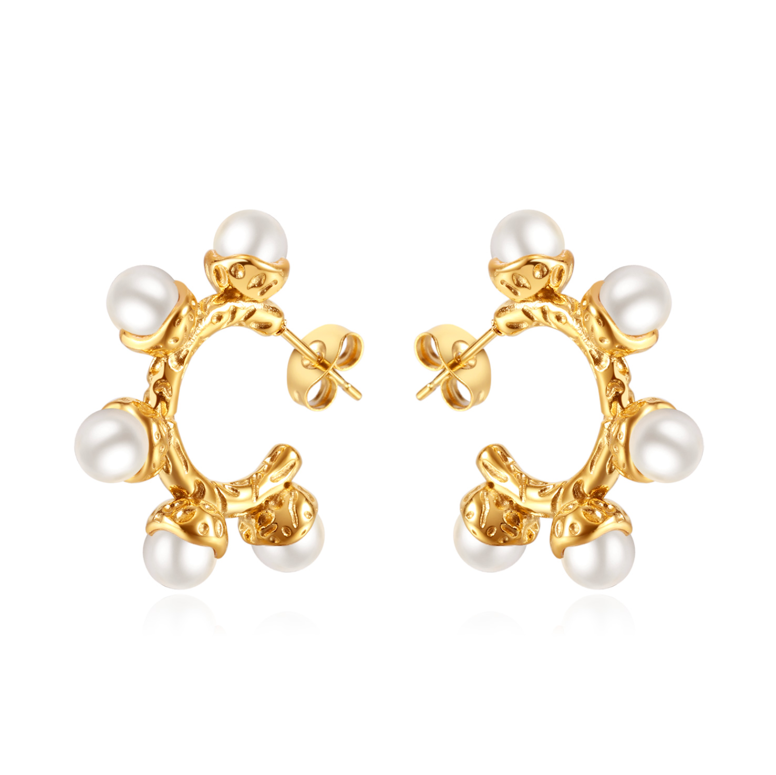 Pearl Hoop Studs C-Shape Earrings - Gold Plated