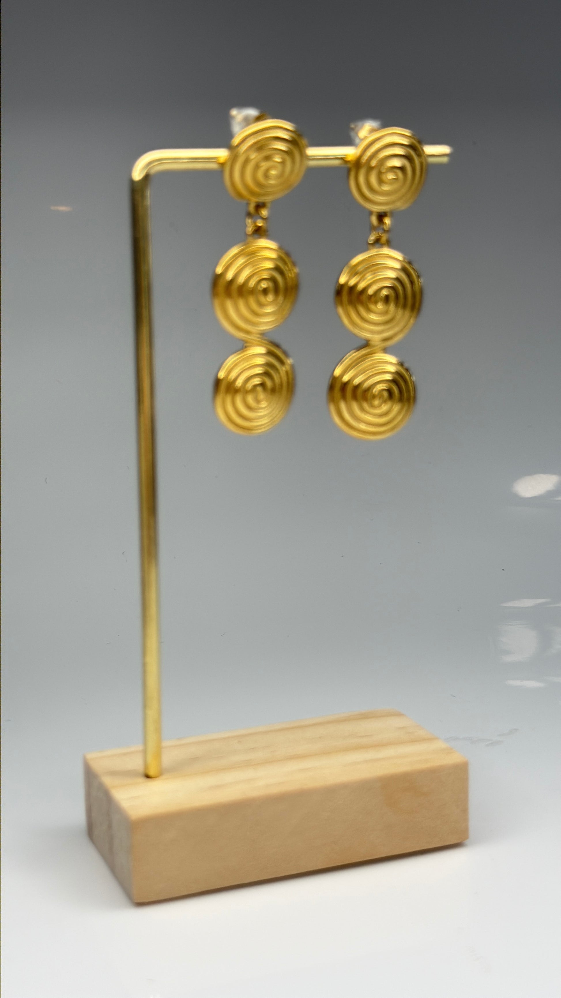 Add dynamic elegance to your look with these Triple Spiral Charms Earrings – Gold Plated, featuring three cascading spiral charms that create beautiful movement and sculptural appeal. Each spiral is smoothly contoured for a fluid, modern look, while the polished gold-plated finish enhances every curve with a radiant glow.
